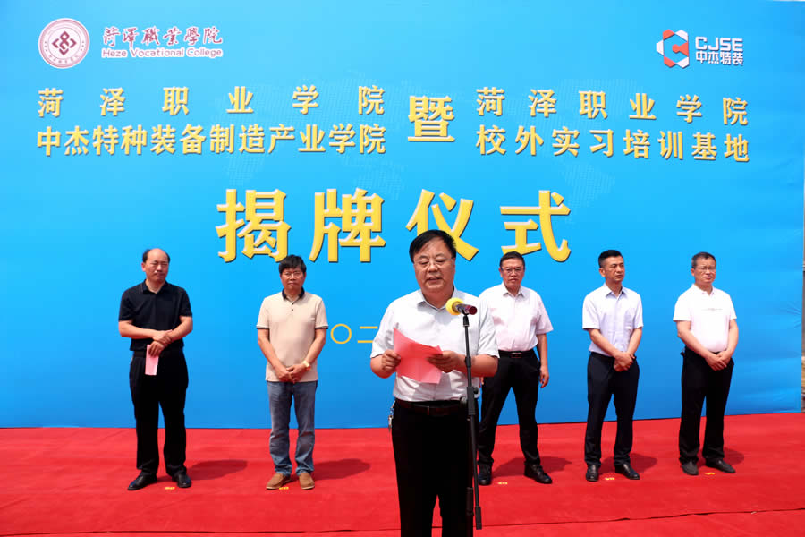 菏澤魯西新區(qū)管委會副主任、文化衛(wèi)生服務中心主任孔魯民在致辭中指出,近年來,魯西新區(qū)堅持創(chuàng)新引領,大力實施科技興區(qū)戰(zhàn)略,將科技創(chuàng)新作為加快新舊動能轉(zhuǎn)換的重要支撐,作為轉(zhuǎn)變經(jīng)濟發(fā)展方式的重要舉措?!昂蕽陕殬I(yè)學院中杰特種裝備產(chǎn)業(yè)學院”暨“菏澤職業(yè)學院校外實習培訓基地”的揭牌成立是魯西新區(qū)產(chǎn)教融合發(fā)展的重要里程碑,菏澤職業(yè)學院與山東中杰特種裝備有限公司的強強聯(lián)合,必將對產(chǎn)教融合、協(xié)同創(chuàng)新提升到一個新的高度。希望雙方以揭牌儀式為契機,在學術、科研、管理、人才培養(yǎng)等方面進一步加深合作交流,以產(chǎn)業(yè)學院和培訓基地為載體,做大做強、做實做優(yōu),培養(yǎng)和吸引更多人才,為魯西新區(qū)高質(zhì)量發(fā)展做出更大貢獻!